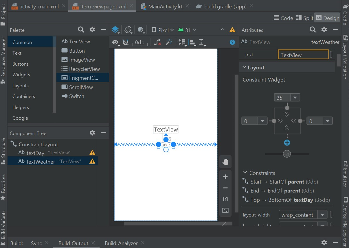 6. 페이지 클래스를 만들어서 구현하기 위해 아이템 레이아웃 변경 ( 두개의 textView : textDay, textWeather )