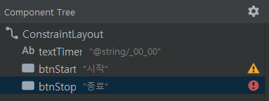 xml 파일을 열어 Design탭 Palette에서 Component Tree로 textView추가하니 생겼다. 노란색 경고 이미지를 클릭해보면 경고 메시지를 확인하고 해결할 수 있다. 1) 경고 이미지 Component Tree 경고 이미지 2) 메..