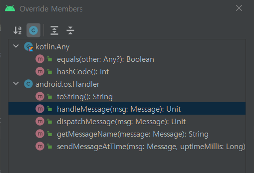 handler 내부에서 ctrl + O 를 누른 뒤 handleMessage를 선택한다.