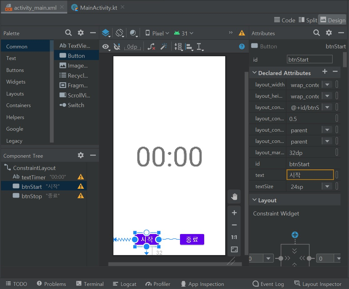 흐른 시간을 보여줄 textTimer, 시작과 종료 버튼( id: btnStart, btnStop )을 각각 만들어준다.
