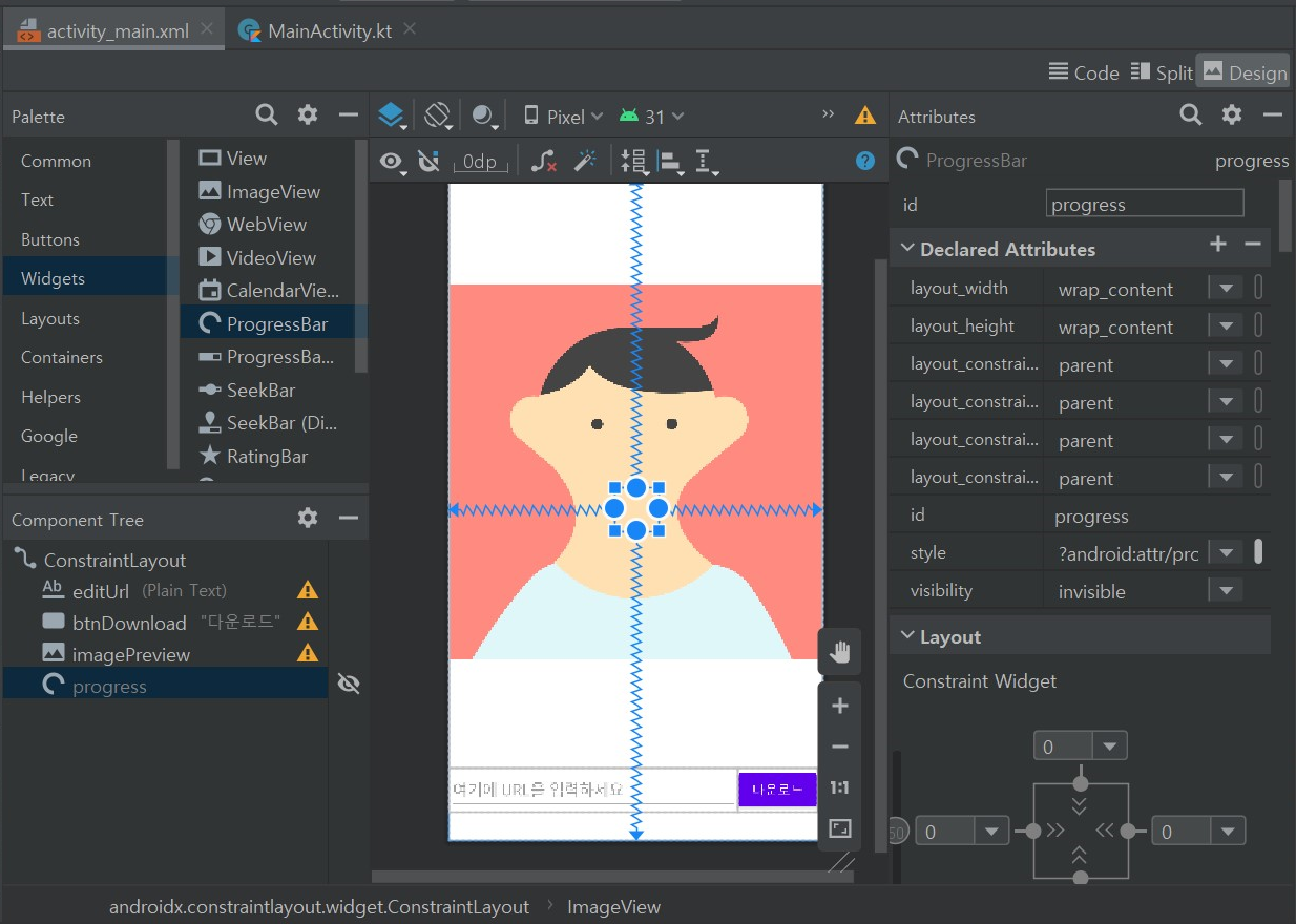 plainText (id: editUrl), button (id: btnDownload), imageView (id: imagePreview), progressBar (id: progress)를 삽입해서 레이아웃을 만들어준다.