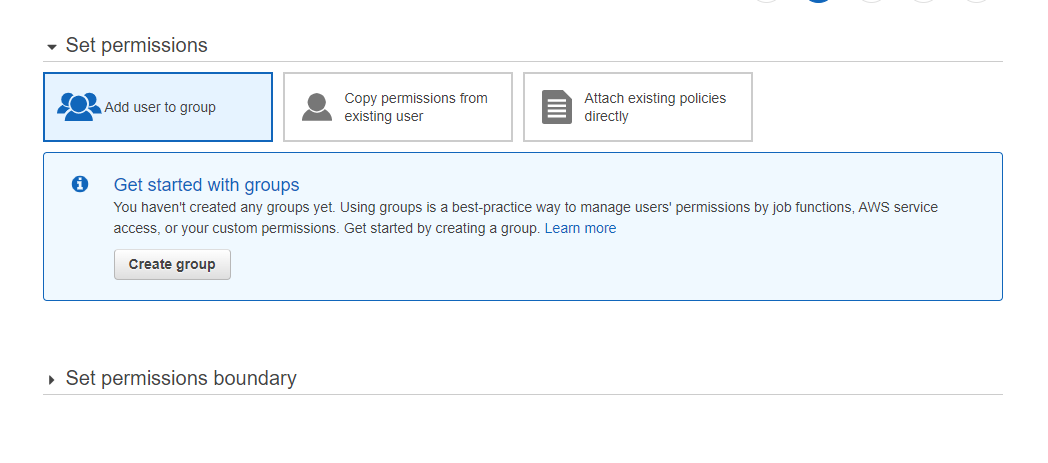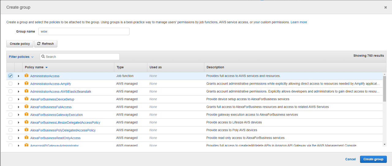 Group이름을 설정 한 다음 가장 상단의 ‘AdministratorAccess’를 체크하여 관리자에 준하는 권한을 부여한다.