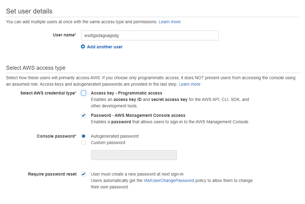 사용자 이름 설정 및 AWS Management Console Access권한을 부여하여 관리자는 초기 계정 생성 이외에는 사용자의 비밀번호 및 다른 요소에 신경쓰지 않아도 된다.