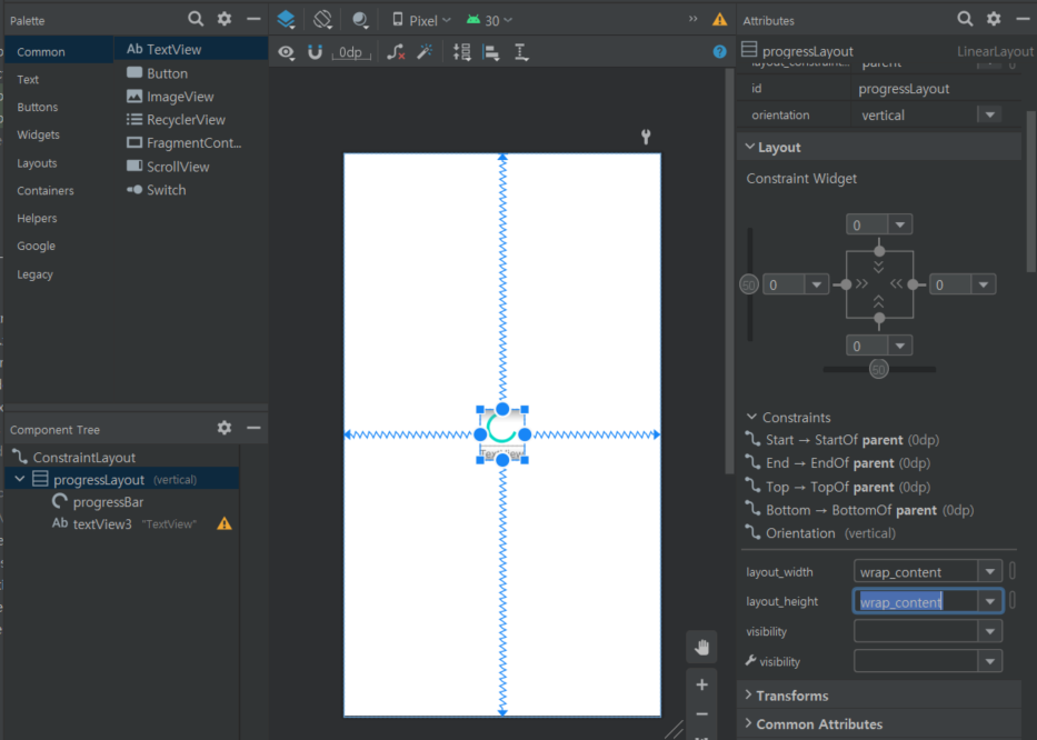 화면 중앙에 배치하기 위해 progressLayout의 layout_width와 layout_height을 wrap_content로 변경해주었다.