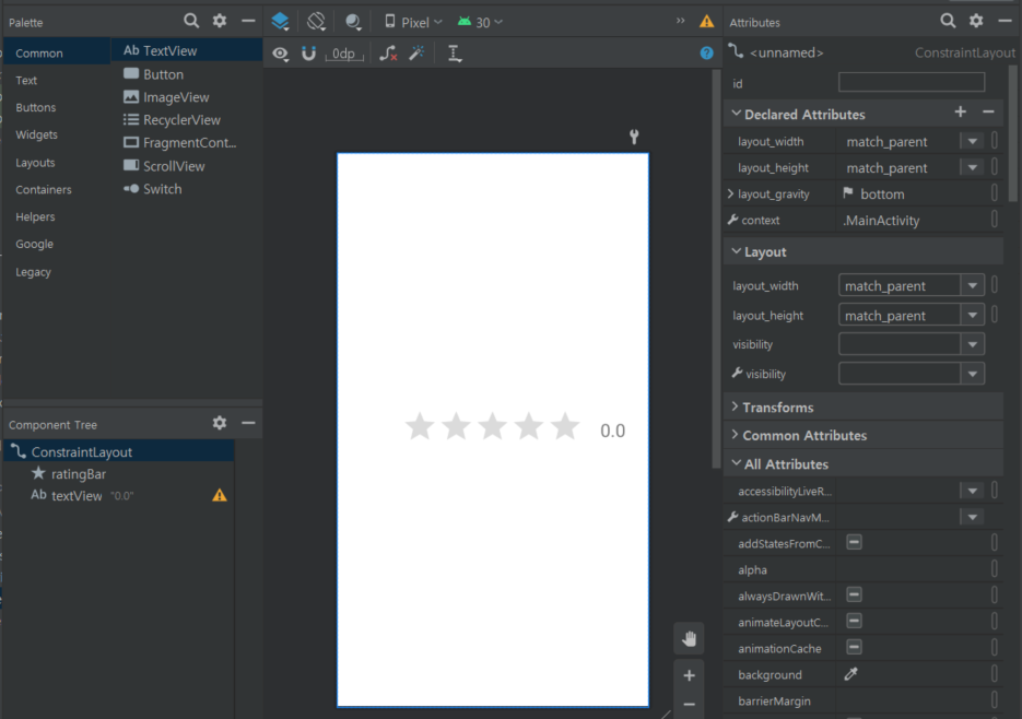 ratingBar의 경우, numStart속성을 통해 별 개수를 바꿀 수 있다. (디폴트는 5개이다)