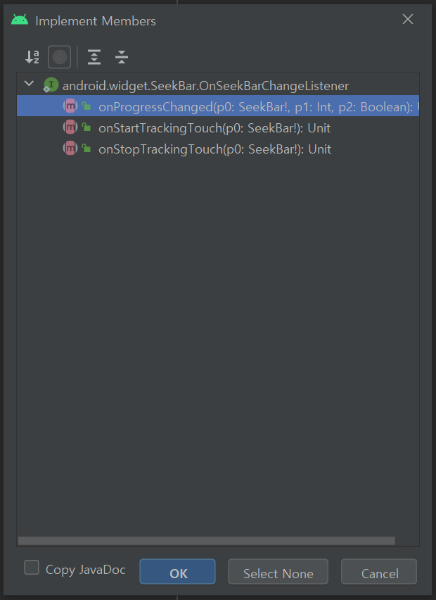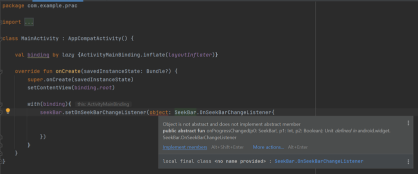 오류의 발생원인은 onSeekBarChangeListener 라는 인터페이스를 사용하기 위해 구현해야 하는 함수가 존재하지 않는다는 것인데, 메시지 속 implement members를 클릭하면 우리가 구현해야 하는 함수들의 목록이 나열됩니다.