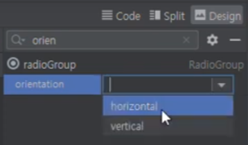 세로로 정렬되어 있는 라디오 버튼들을 가로로 정렬하고 싶을 때는, xml로 넘어와 우측 상단의 Atrributes 검색창에 orientation을 검색합니다.