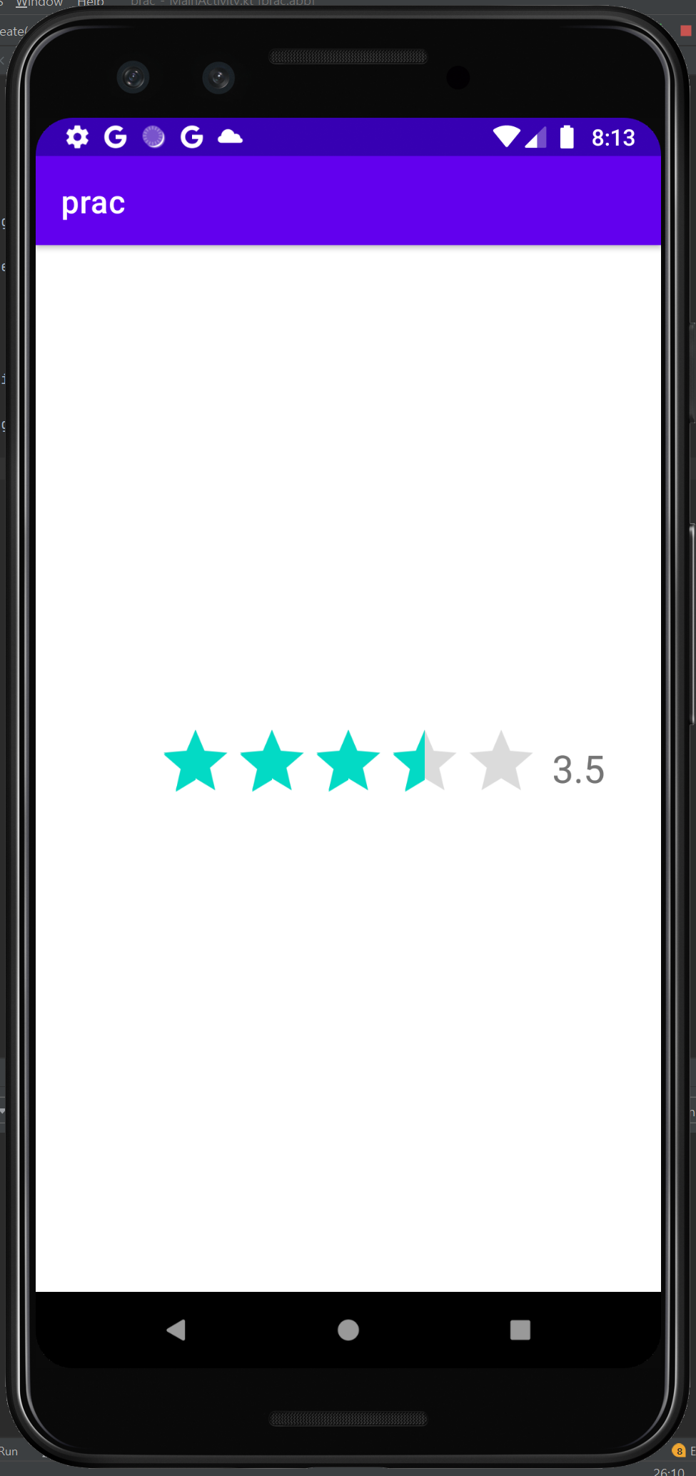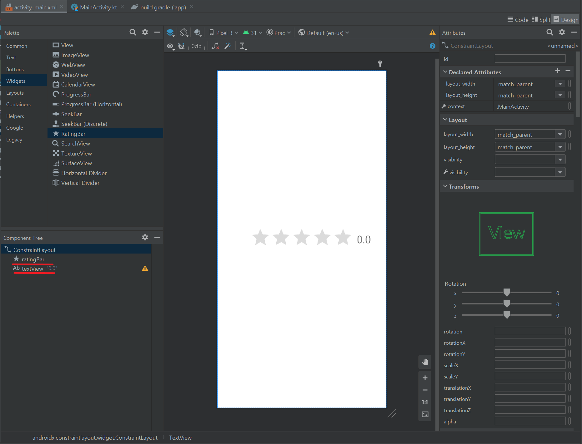 xml 파일에서 Palette > Widgets > RatingBar를 화면에 하나 생성합니다. 별점 수를 출력할 텍스트뷰 하나도 생성하여 constraint를 레이팅바와 연결해준 뒤 메인 액티비티에서 코드를 작성하겠습니다.