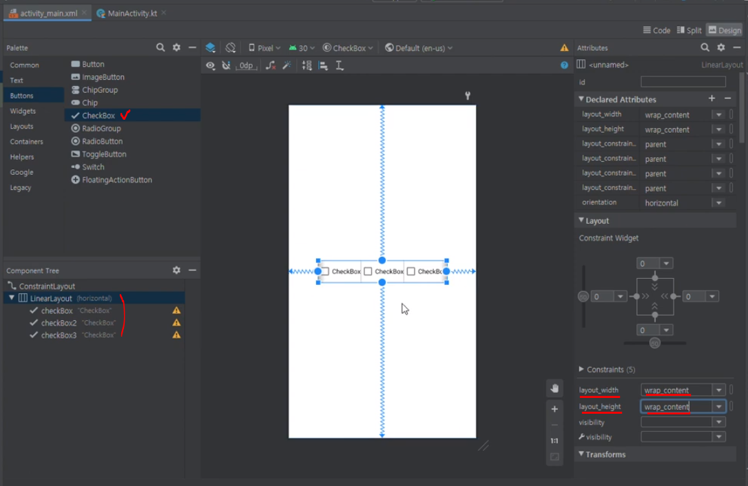 LinearLayout이 생성되고 나면 Buttons > CheckBox 를 드래그해 화면에 끌어다놓습니다. 세 번 반복해 세 개의 체크박스를 생성해줍니다.