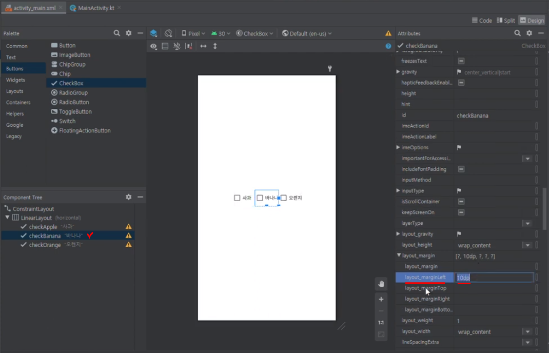 checkBanana 체크박스를 선택한 뒤 우측 Attributes 탭에서 layout_marginLeft의 값을 10dp로 변경해주었습니다. 우측 간격을 수정하고 싶을 때는 layout_marginRight, 위 아래 간격을 수정하고 싶을 때는 각각 layout_marginTop, layout_marginBottom을 수정하면 됩니다.