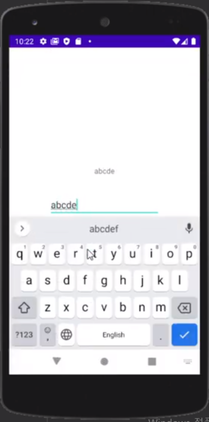 에뮬레이터를 실행하면, editable로 전달된 실시간 입력값이 textView.text 함수를 통해 텍스트뷰 위젯에 그대로 반영되어 화면에 나타나는 것을 확인할 수 있습니다.