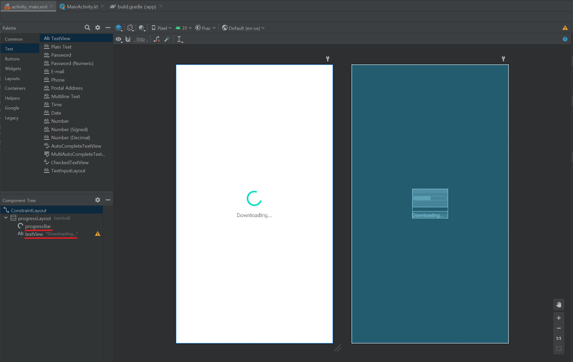 체크 박스를 생성할 때 했던 것처럼, 먼저 xml 파일에서 Palette > Layouts > LinearLayout 을 생성해줍니다. 우리에게 익숙한 로딩창을 구현하기 위해 vertical로 설정하고, constraint 값은 모두 0으로 설정합니다. 그 후 직전에 설정한 레이아웃 하위에 Widgets > ProgressBar (원형) 으로 프로그래스바를 생성합니다. 텍스트뷰도 하나 생성하여 그 내용을 "Downloading..."으로 설정해주었습니다. 이제 메인 액티비티로 넘어가 코드를 작성합니다.