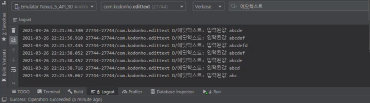 코드를 실행한 뒤 logcat에서 "에딧텍스트"를 검색하고 에뮬레이터에서 값을 입력하면 키보드 입력에 따라 로그가 업데이트 됩니다.