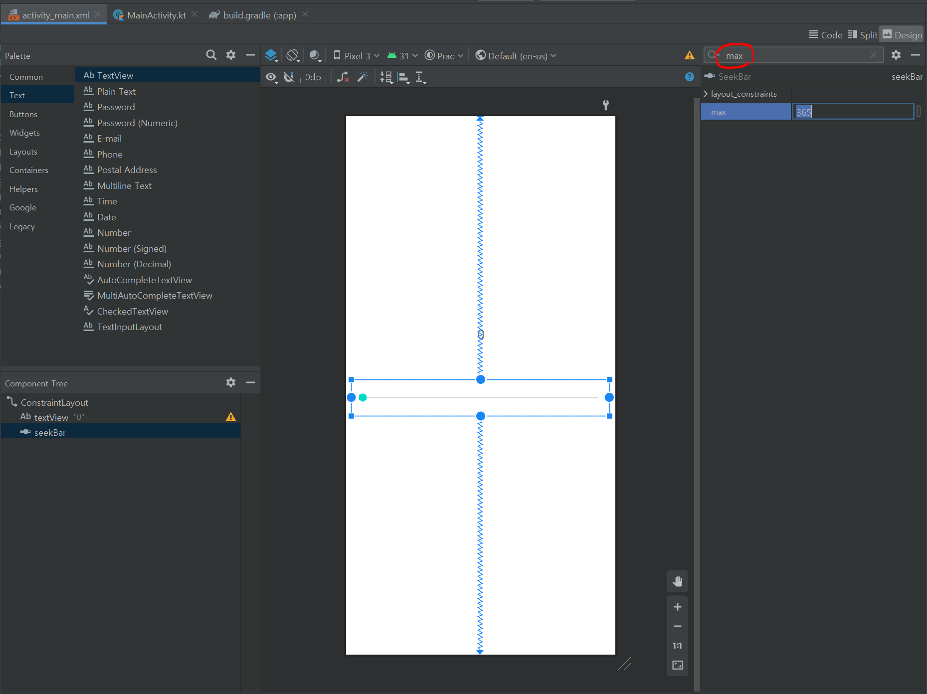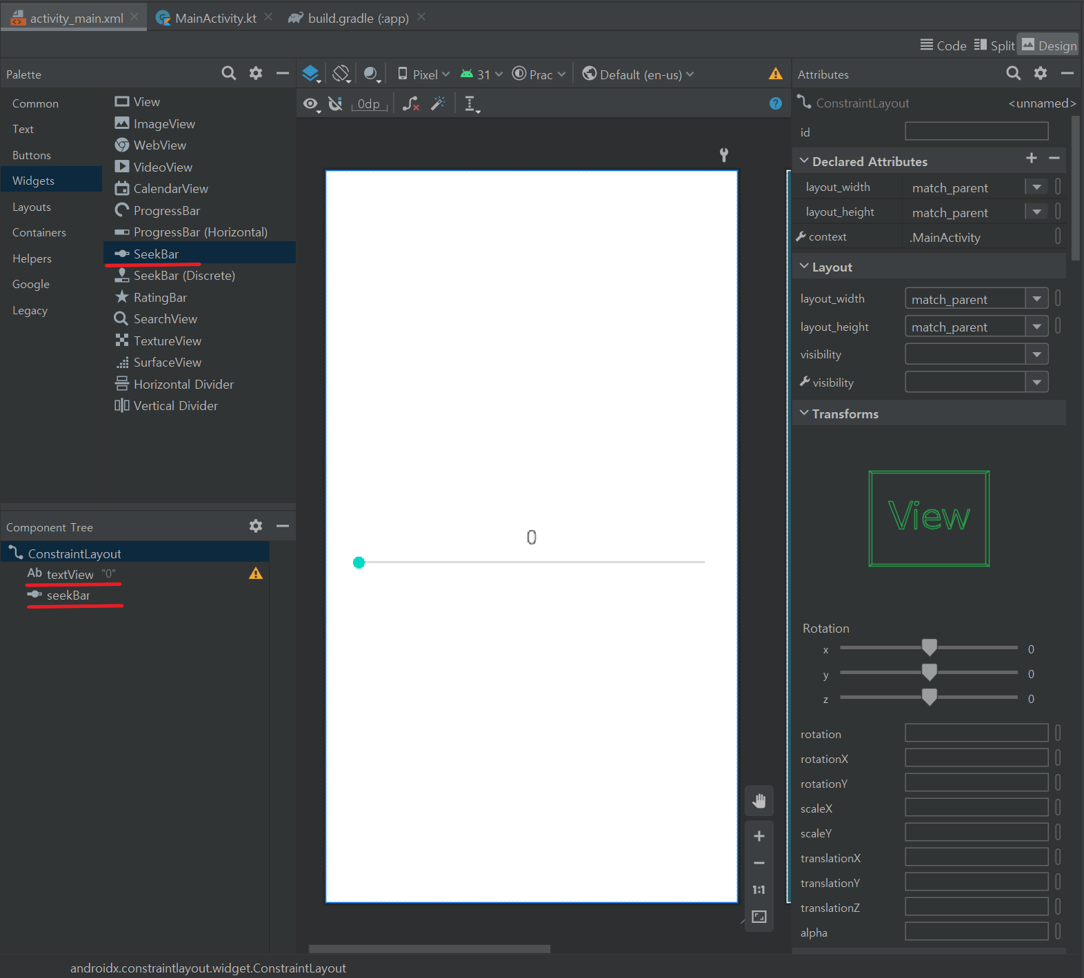 xml의 Palette > Widgets > SeekBar 를 선택해 화면에 생성해줍니다. SeekBar (Discrete)는 구간 표시가 되어 있는 시크바입니다. 시크바의 특성상 가로가 화면에 꽉 차도록 설정합니다. 텍스트뷰도 하나 생성하여 내용을 '0'으로 입력해주겠습니다. 그 후 메인 액티비티로 넘어와 코드를 작성합니다.