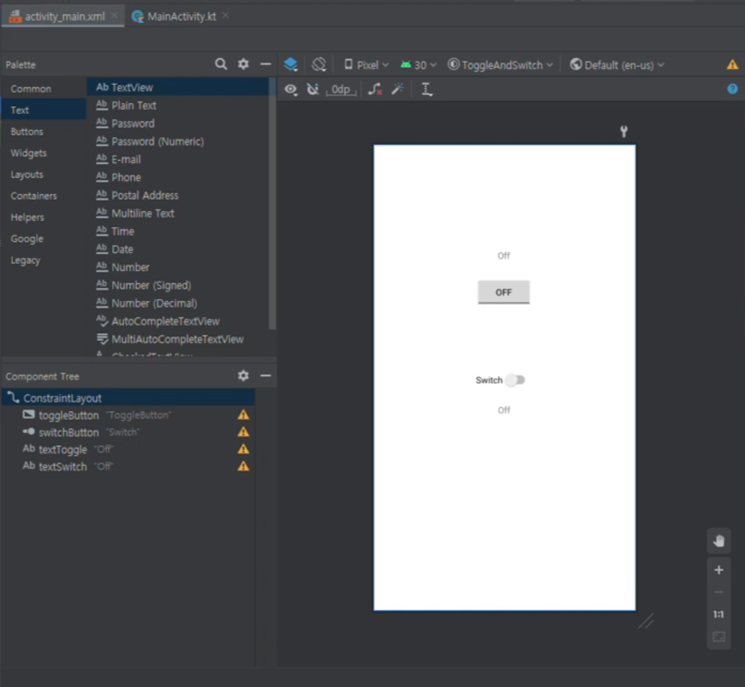 토글 버튼은 Palette > Buttons > ToggleButton에서 생성하고, 스위치 버튼은 Palette > Buttons > Switch에서 생성합니다. 각자의 아이디를 부여해준 뒤 토글 버튼과 스위치 버튼의 동작에 따라 변경되는 값을 화면에 표시해주기 위해 두 개의 텍스트뷰를 생성합니다. 토글 버튼에 할당된 텍스트뷰는 textToggle, 스위치 버튼에 할당된 텍스트뷰는 textSwitch로 설정하였습니다. 또한 현재 토글 버튼과 스위치 버튼이 Off를 가리키고 있으므로, 두 개의 텍스트뷰의 내용은 'Off'로 설정해줍니다.