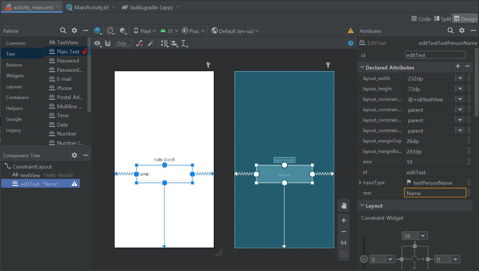 | 💡 새로운 뷰를 추가할 때는 반드시 우측의 Layout > Constraint Widget에서 뷰의 상하좌우 위치를 고정(constraint)시켜야 합니다. 왼쪽과 오른쪽에 같은 값을 입력하면 뷰를 화면 가운데에 위치시킬 수 있습니다. |