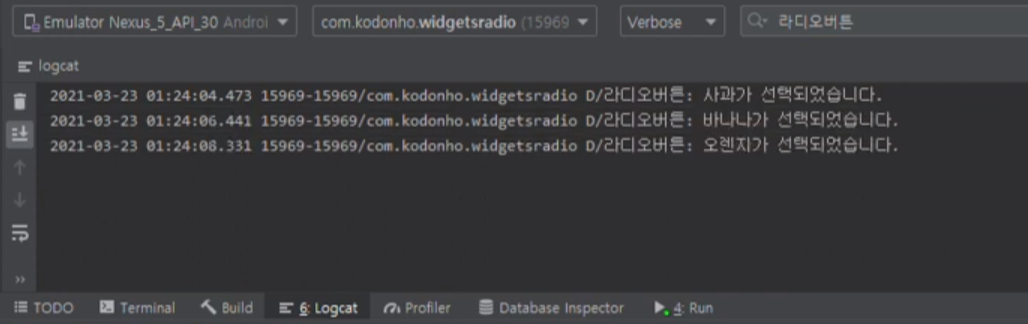 에뮬레이터를 실행하여 화면에서 라디오 버튼을 클릭할 때 logcat에서 로그가 업데이트됨을 확인할 수 있습니다.