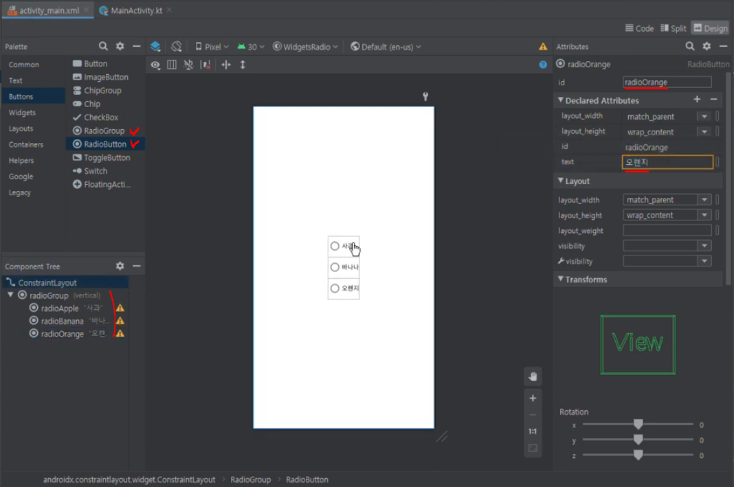 xml에서 Buttons > RadioGroup 을 선택해 하나의 라디오 그룹을 생성하고, 같은 위치의 RadioButton을 드래그해 Component Tree의 RadioGroup 밑으로 옮겨 RadioGroup 하위의 라디오 버튼들을 생성합니다. 라디오 버튼들의 id를 각각 radioApple, radioBanana, radioOrange로 설정한 뒤, 아래의 text에서 내용을 '사과', '바나나', '오렌지'로 설정합니다. 메인 액티비티로 넘어와 앞서 생성한 라디오 버튼들에 클릭 처리가 가능하도록 코드를 작성합니다.