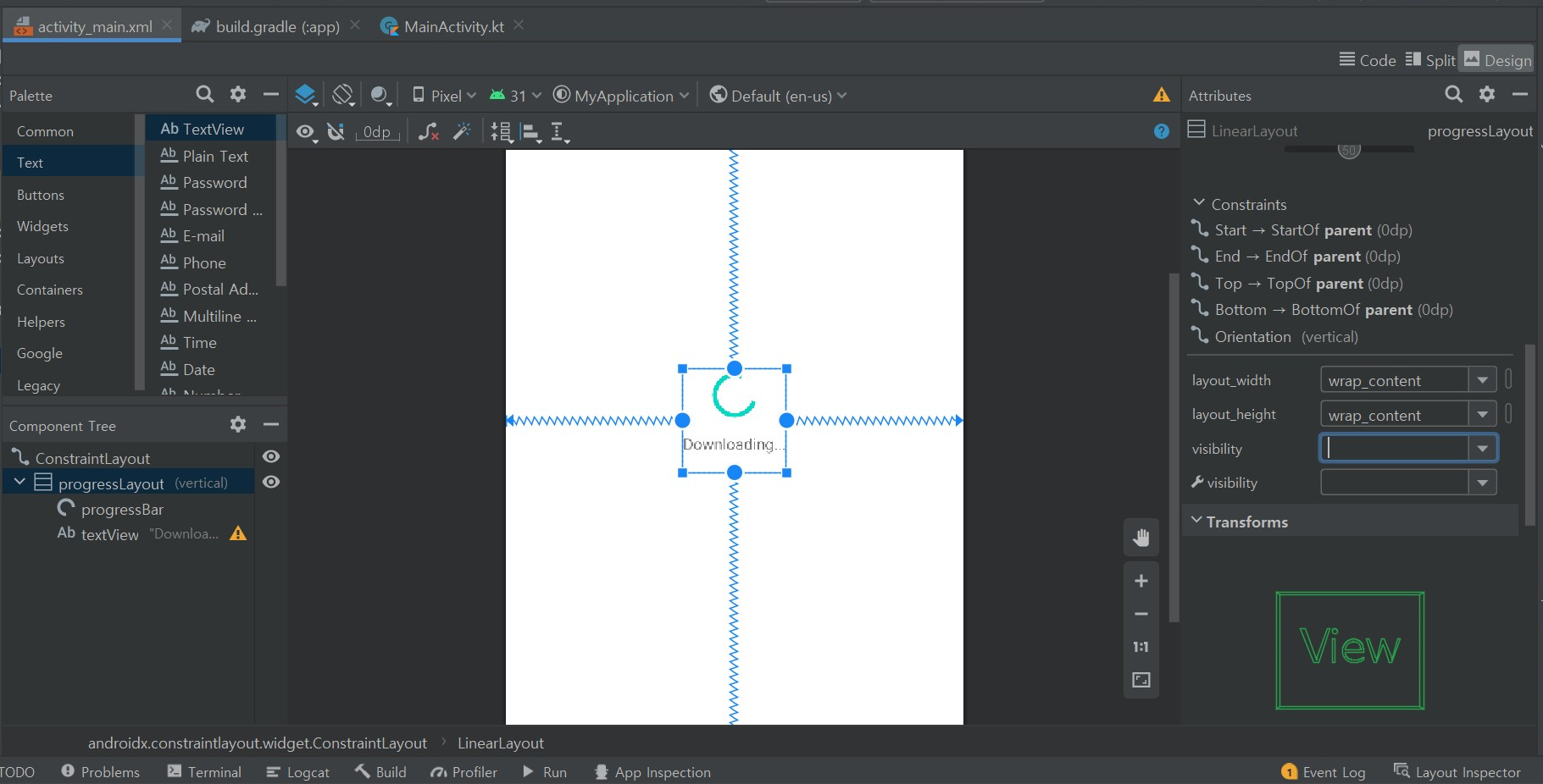 디자인 요소 위젯: Linear layouts (vertical) 안에 progress bar과 text를 가져온다.
