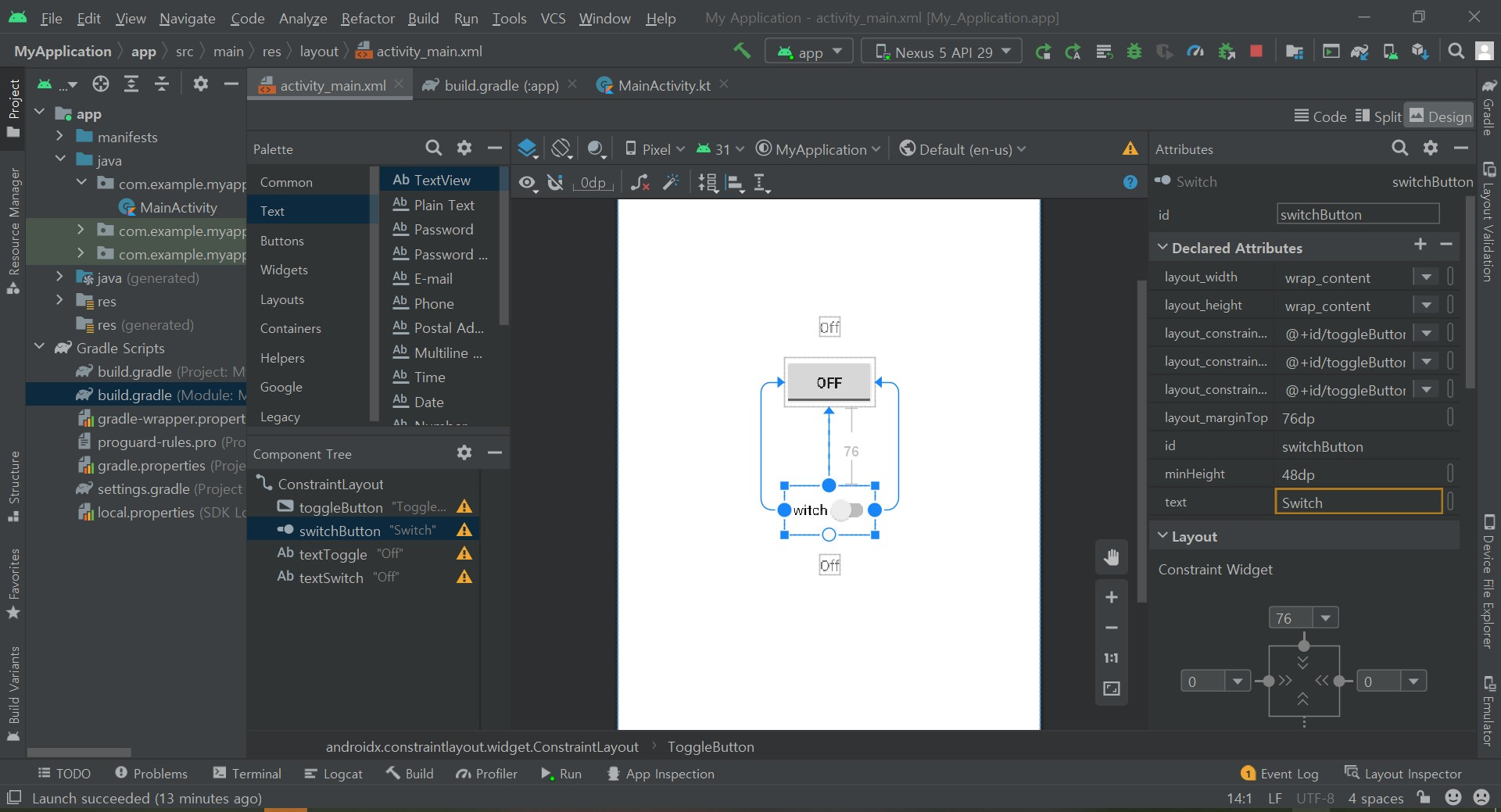 우선 activity_main.xml 파일에서 토글버튼과 스위치버튼을 가져와 배치하고 각각 textview도 만들어 준다.