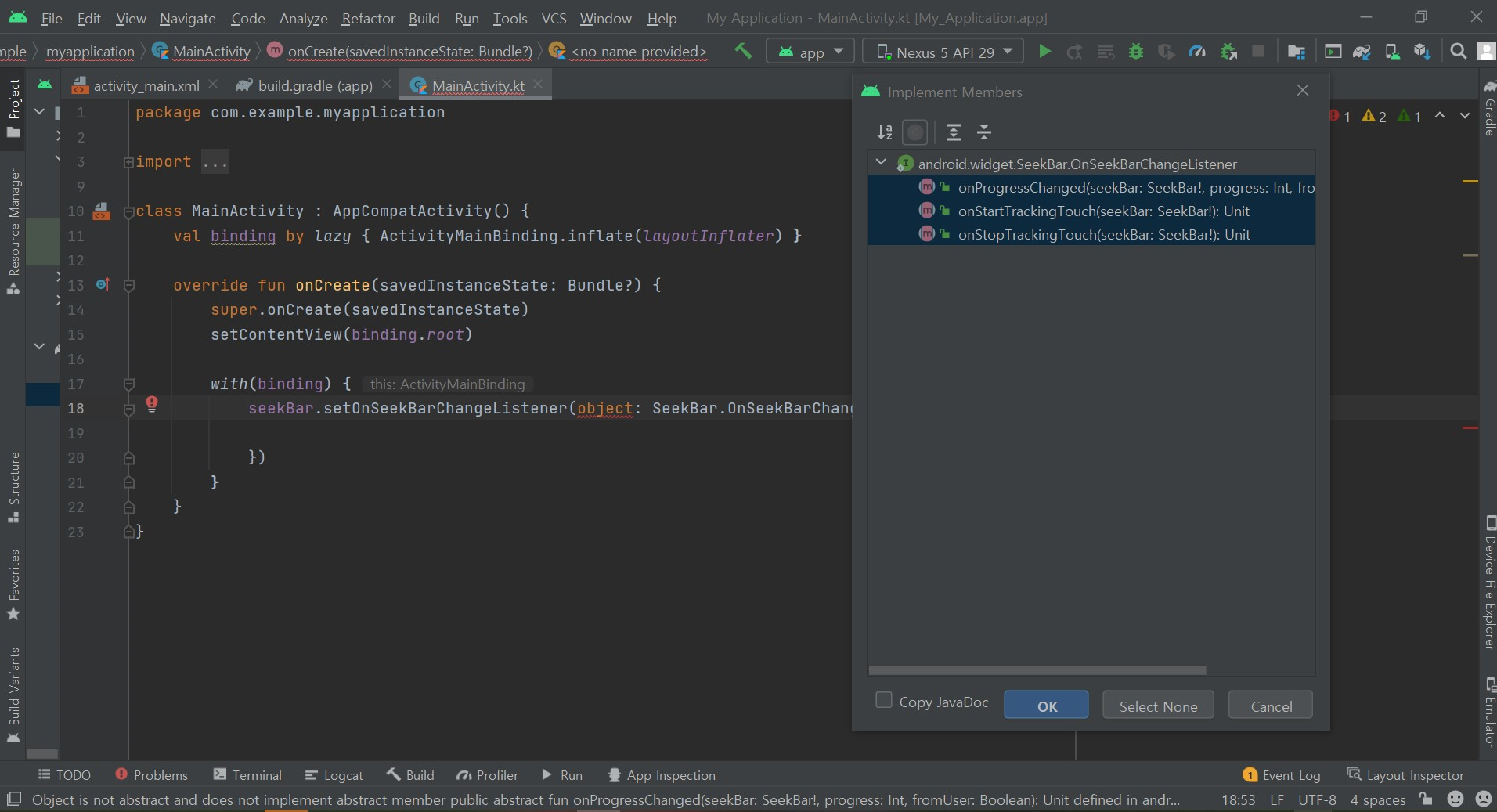 setOnSeekBarChangeListner함수에서 setOnSeekBarChangeListner 인터페이스 안에 있는 함수들을 override해서 작성해줘야한다. ( 커서를 올리면 implement members가 나오는데 아래처럼 모두 선택하여 함수들을 구현해준다. )