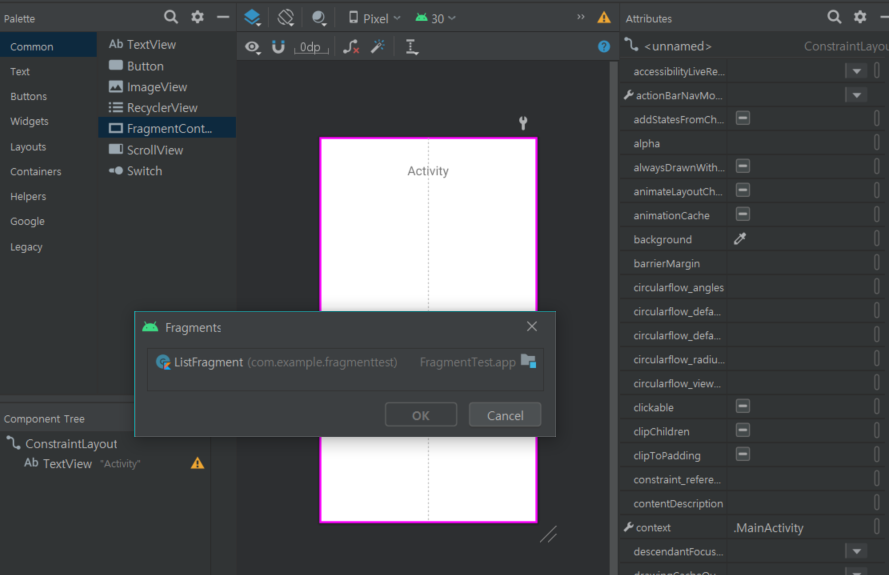 팔레트에서 FragmentContainerView를 화면에 끌어다 놓으면, 내가 만들어둔 Fragment목록이 뜬다. 사용할 Fragment를 선택해서 넣고 위치를 잡아주면 된다.