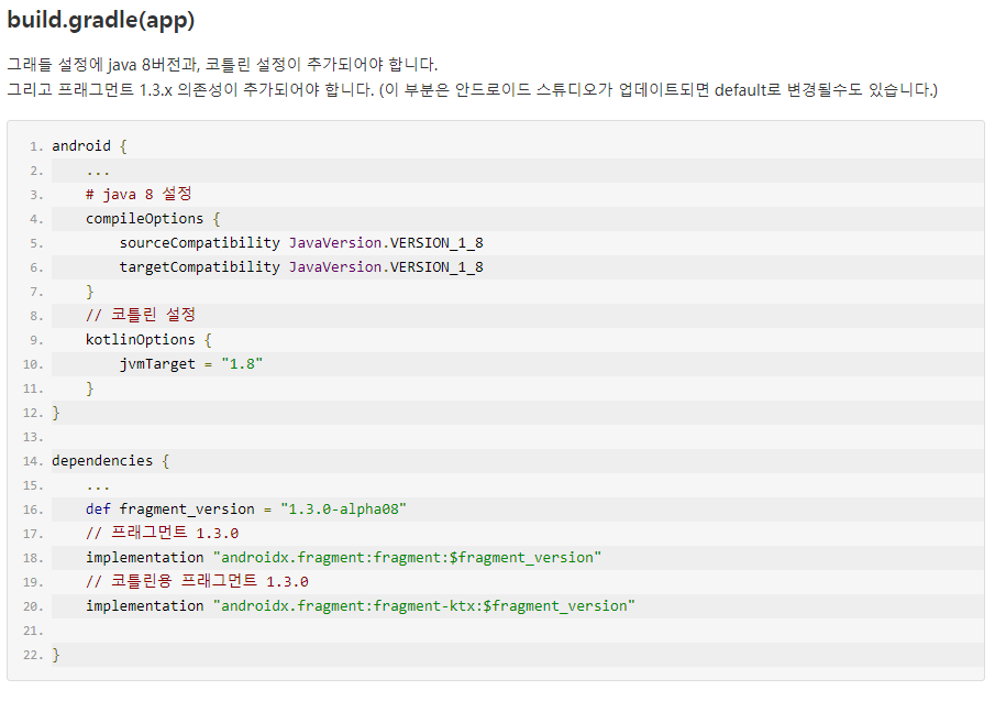 이와 같은 FragmentManager를 활용하기 위핸, build.gradle(app)에 코틀린 설정을 추가해주어야 한다.