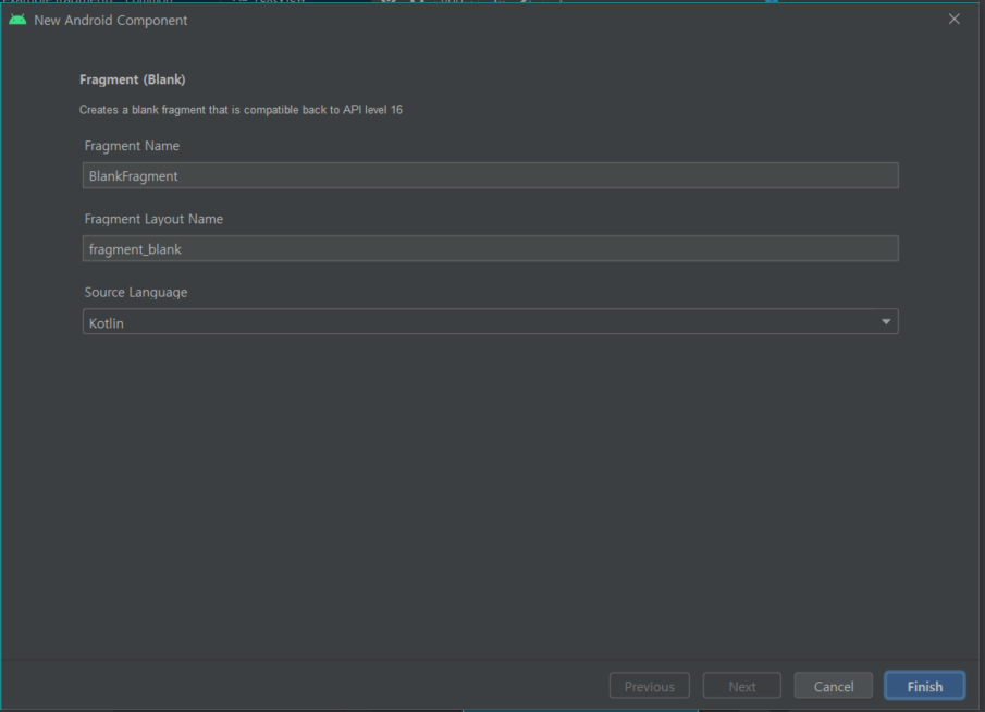 Fragment를 생성하고 나면 Fragment.kt파일과 layout을 설정하는 xml파일이 생성된다.
