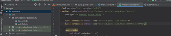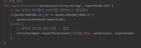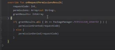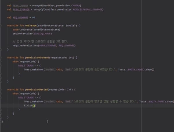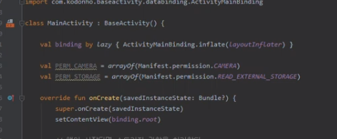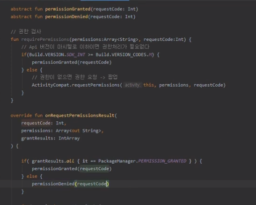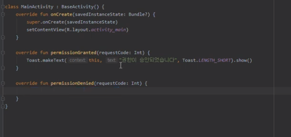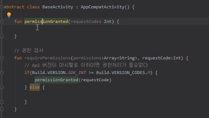 abstract fun permissionGreanted ~ 메인에서 베이스의 엡스트랙트로된 멤버를 강제로 구현해야한다.
