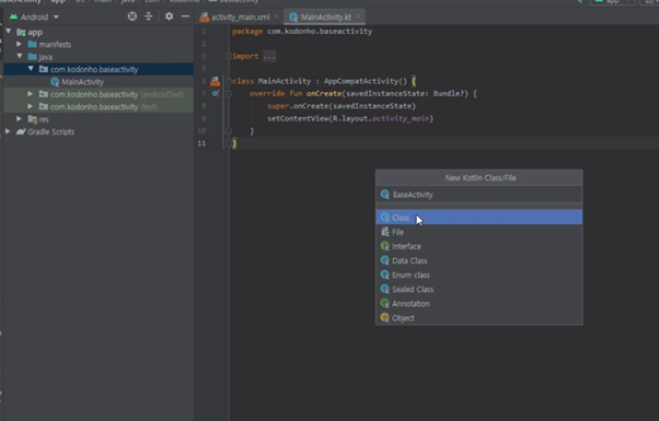 베이스 엑티비티는 그냥 코틀린 클래스로 만들어준다.