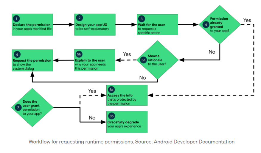 위 사진은 어플리케이션에서 유저와 앱이 권한 허가에 대해 서로 상호작용하는 것을 도표화 시킨 것이다. 이 사진을 이해한다면 허가에 관한 코드들을 이해하는데 큰 도움이 된다.