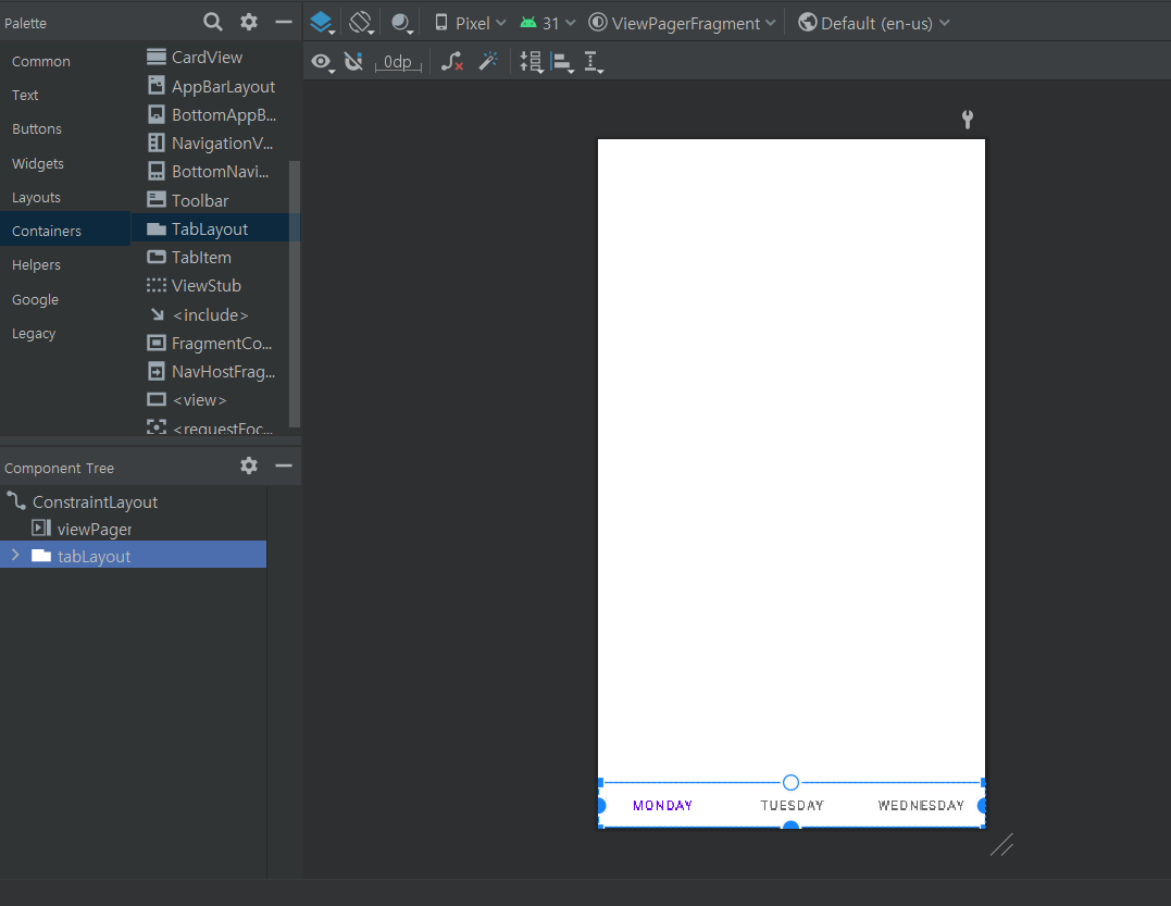 viewPager와 TabLayout을 가져와 아래 사진과 같이 배치